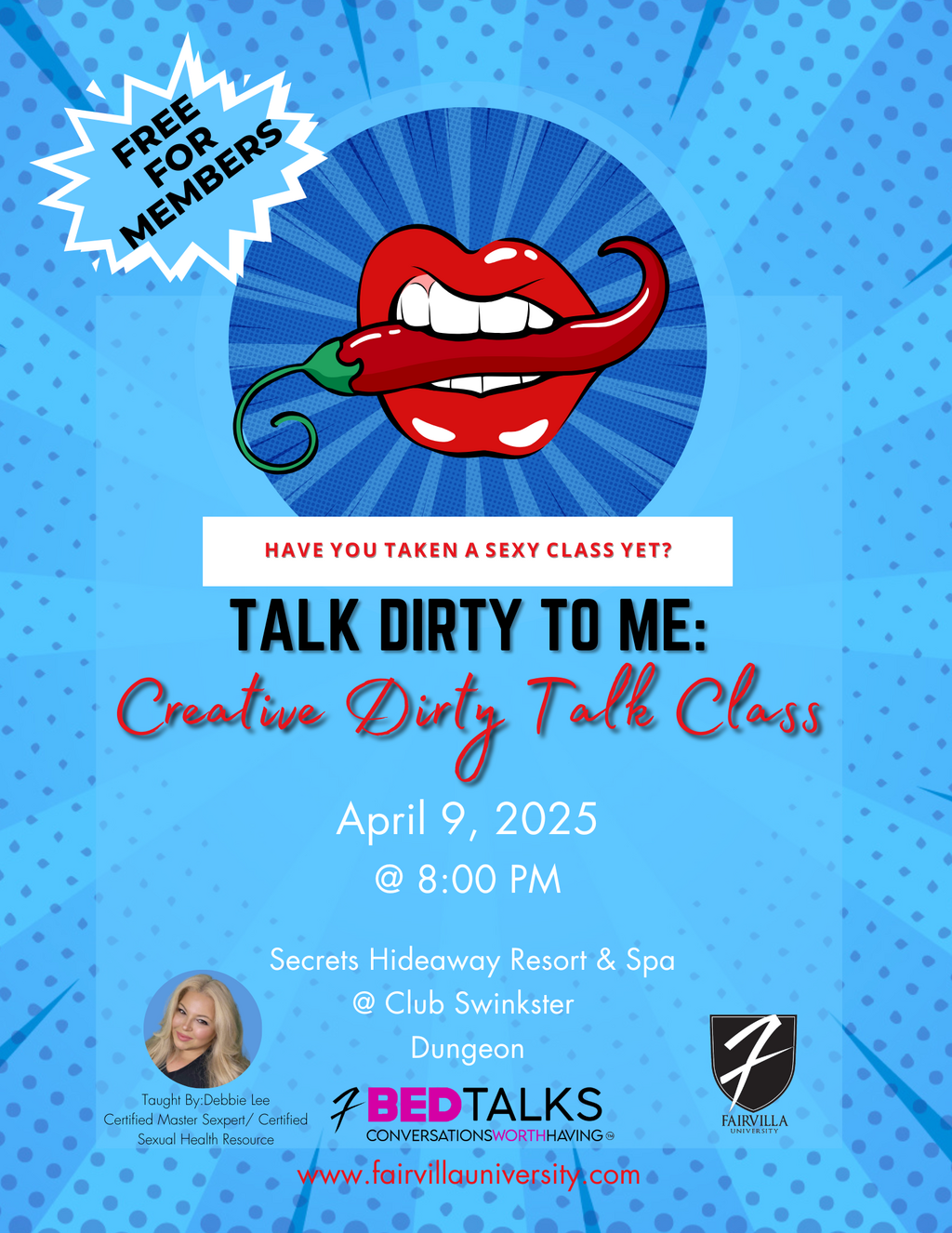 Join Fairvilla® inside Club Swinkster™ for Talk Dirty 101, starting at 8pm. If you’ve ever been intrigued by the idea of dirty talk but weren’t sure how to begin, or if you find yourself repeating the same phrases, this class is for you! Led by Fairvilla’s Certified Master Sexpert and the Duchess of Dirty Talk, Debbie Lee, you’ll learn how to bolster your confidence and expand your sexual vocabulary in an intimate, judgment-free setting. Prepare to explore the excitement of erotic language, develop new ways to express your desires, and make every encounter feel fresh and compelling.