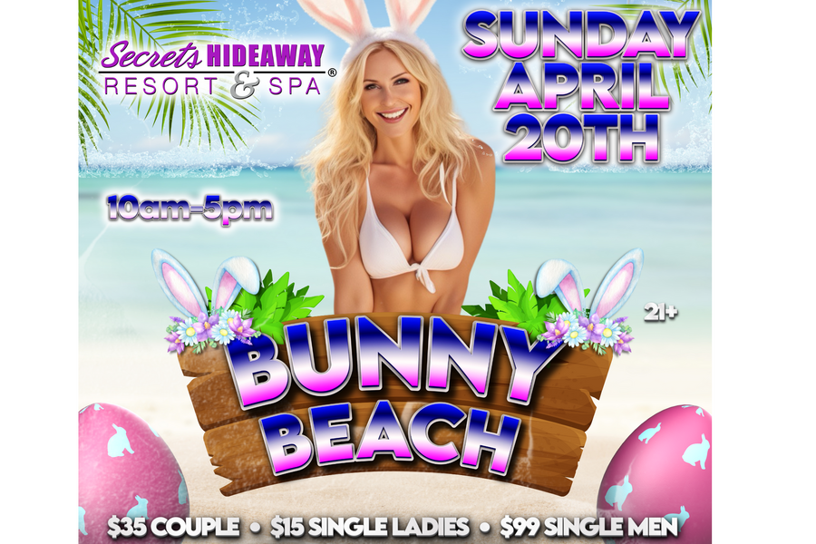 Secrets Hideaway presents the "Bunny Beach" pool party event on Sunday, April 20th. Get ready to hop into a world of sun-kissed skin and playful vibes as you celebrate Easter in the sexiest way possible. Adorn those bunny ears, flaunt your tail, and embrace the clothing-optional atmosphere that encourages you to bare it all. Whether you’re splashing in the pool, lounging under the warm sun, or mingling with like-minded guests, this day is all about letting your sensual side shine through in a relaxed and inviting setting.