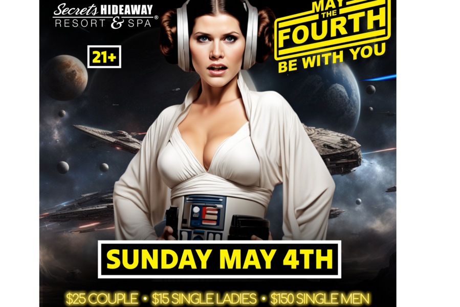 As you explore every corner of our space-inspired party, let the beats guide you through an evening of out-of-this-world encounters and flirtatious adventures. Gather with fellow enthusiasts who share your passion for epic battles, unforgettable heroes, and epic plot twists—all while indulging in the allure and mystique that Secrets Hideaway is known for. Get ready to declare your allegiance, embrace your powers, and feel the force flow through you—because on this special night, we’re taking “May the Fourth Be with You” to the next level of galactic excitement!