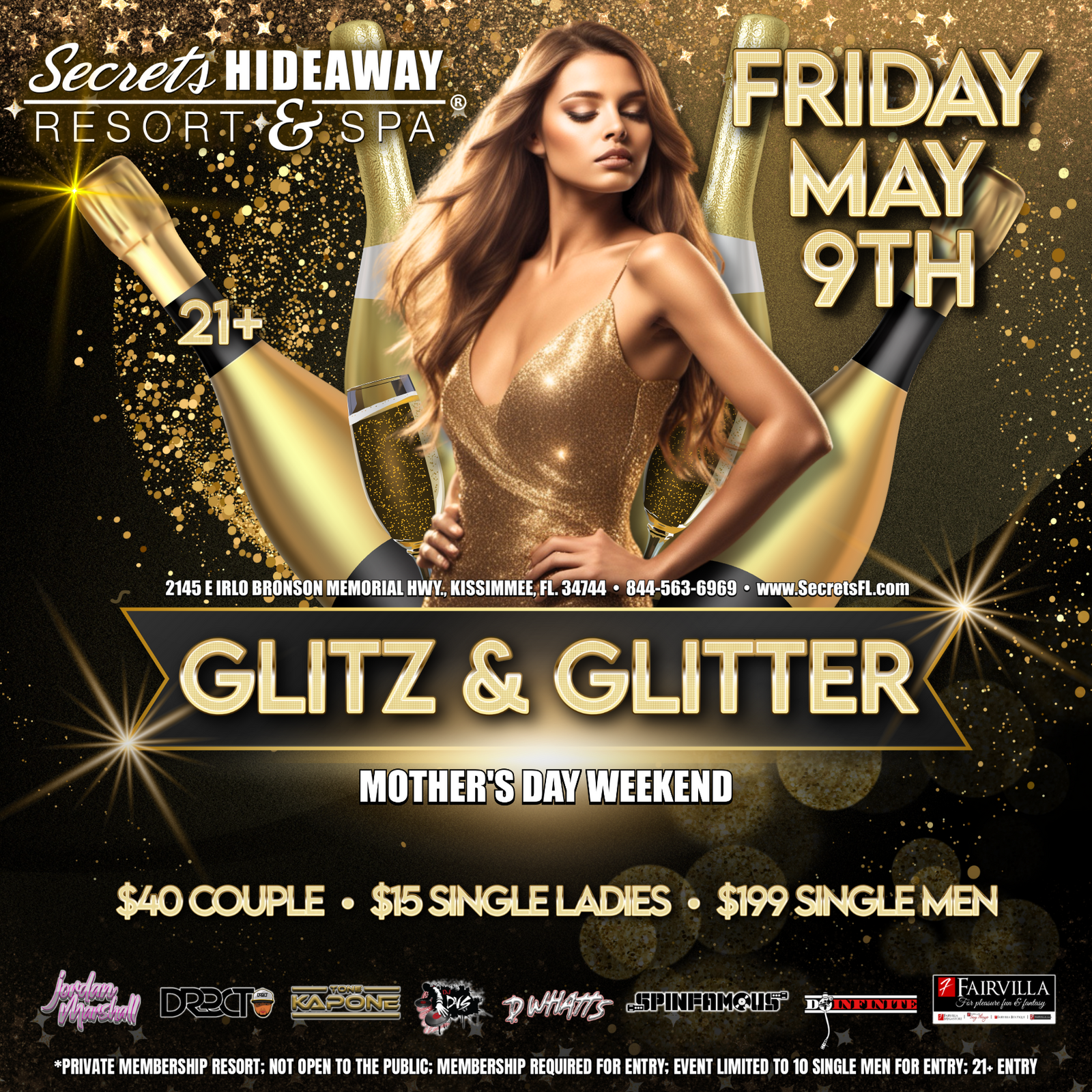 Secrets Hideaway presents "Glitz & Glitter" on Friday, May 9th, a night dedicated to all things sparkly, shimmering, and absolutely fabulous. Slip into your most dazzling attire—think sequins, rhinestones, and metallic accents—and get ready to shine under the spotlight. Whether you’re aiming for a subtle shimmer or head-to-toe glitter, this event is about embracing your inner star, letting every twinkle reflect your vivacious spirit, and lighting up the dance floor in pure, radiant style.