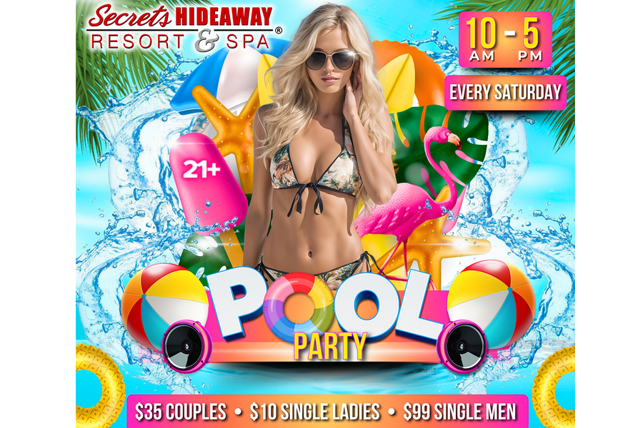At the Saturday Pool Party, the atmosphere is charged with an electrifying blend of sensuality and sunshine. For those seeking the ultimate in luxury and privacy, reserving a pool-side cabana offers eight hours of opulent relaxation, where you can bask in the sun-kissed ambiance and indulge in arousing fun. Alternatively, slip away to the inviting playrooms, where you can create your own heat and explore the depths of your desires. Whether you're lounging in luxury, dancing under the open sky, or discovering the intimate corners of Secrets Hideaway, the Saturday Pool Party promises a day of unbounded pleasure, liberating experiences, and unforgettable connections with like-minded souls. Dive into the weekend with a splash of excitement, celebrating summer in the sexiest, most enticing way imaginable.