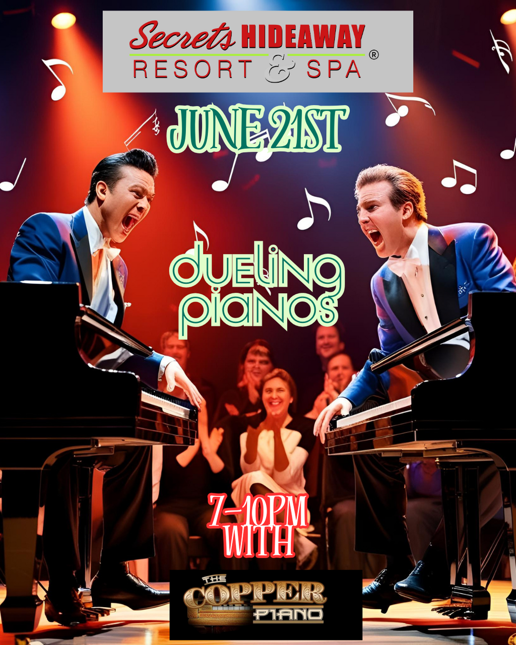 All the parties are located at Secrets Hideaway Resort & Spa®. For reservations: Visit our reservations page Click here for Reservations , call 844-563-6969 or book by clicking the Red "Book a Room" button at the top of each event page.
