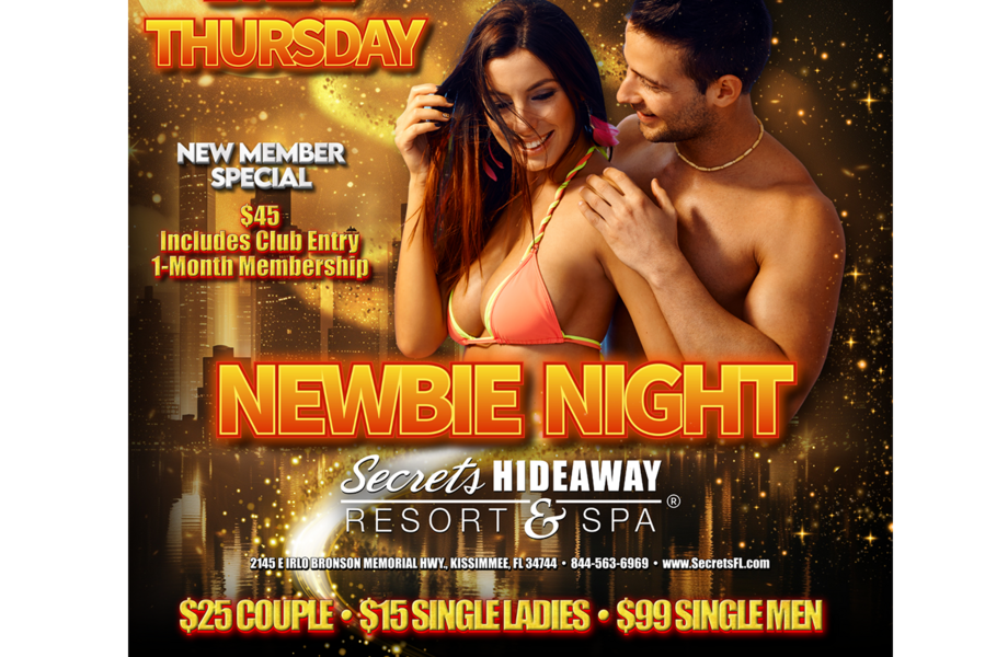 Every Thursday night, Secrets Hideaway invites you to dive into a world of exciting possibilities at our Meet & Greet Newbie Night. If you're new to the lifestyle or simply looking to expand your circle of like-minded friends, this is the perfect event for you. Imagine a vibrant atmosphere filled with diverse and open-minded individuals, all eager to explore the realms of sensuality and connection. For an incredible New Member Special price of just $45 per couple, you not only gain access to the hottest newbie night in the industry but also receive a one-month membership to Secrets Hideaway Resort and Spa. It's an opportunity to step into a realm of pleasure, where you can create your own secrets and embark on a journey of exploration in the company of fellow enthusiasts.