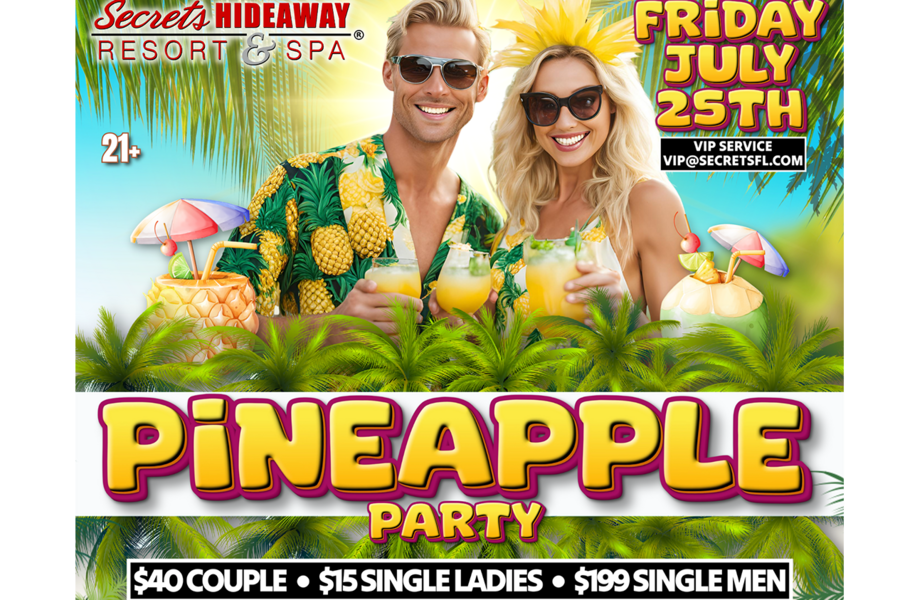 Secrets Hideaway presents "Pineapple Party" on Friday, July 25th, inviting you to tap into the universal swinger symbol and show off your true lifestyle spirit. Get out those pineapple outfits, add a little extra tropical flair, and let your playful side shine! Whether you’re rocking a bold pineapple print or showcasing a subtler nod to everyone’s favorite fruit, this is your chance to celebrate in a community that understands the cheeky magic behind the pineapple. Expect vibrant music, colorful décor, and an atmosphere that radiates excitement and open-minded connection.