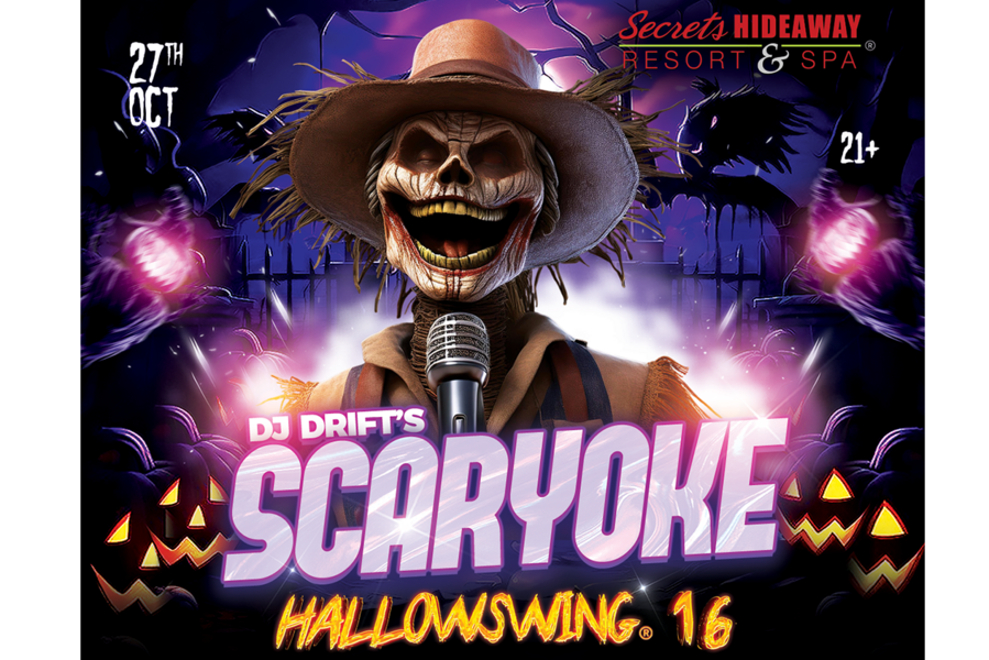 Secrets Hideaway Presents: Hallowswing® 16 "Scaryoke" on Monday, Oct 27th—a haunted karaoke extravaganza where spine-tingling tunes and ghostly grooves set the stage for a night of eerie, musical mayhem. Step into a realm of spectral sound and macabre merriment as the lights dim and the stage comes alive with chilling karaoke performances. Whether you’re belting out haunted ballads or whispering eerie verses in the dead of night, "Scaryoke" promises a thrilling fusion of horror and harmony that will leave you shivering with excitement.