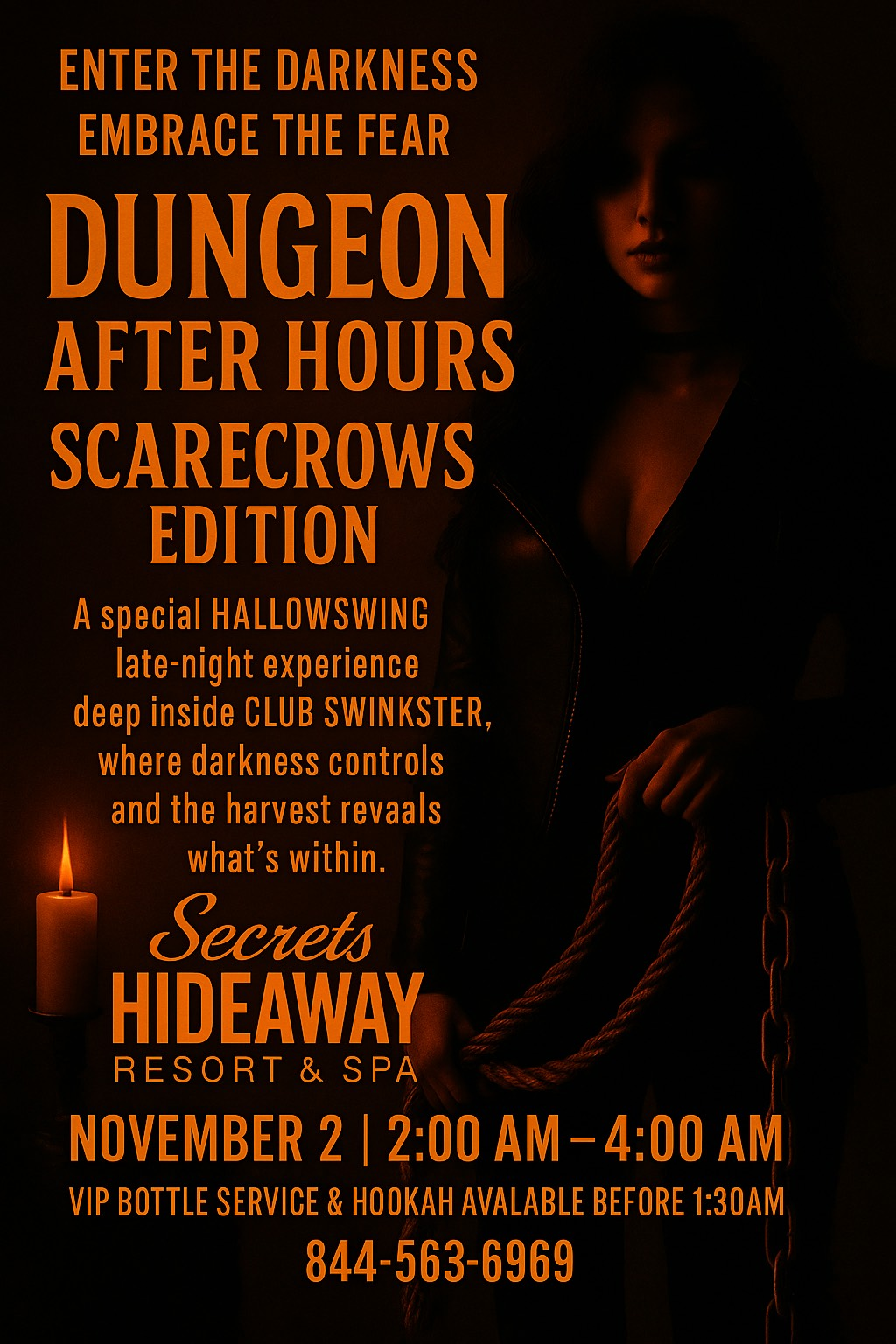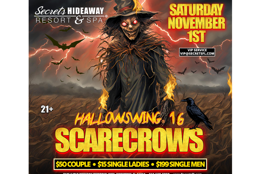 Secrets Hideaway presents Hallowswing® 16 "Scarecrows" on Saturday, November 1st — where terror takes center stage. Step into a realm of nightmare where things that go bump in the night come to life; menacing scarecrows stand guard in desolate fields, their ragged silhouettes illuminated by eerie, flickering lights. The air is thick with dread as terrifying screams echo in the distance and you feel the cold grip of fear urging you to run. Every shadow conceals a deadly secret and every creak in the dark signals the arrival of something truly horrific.