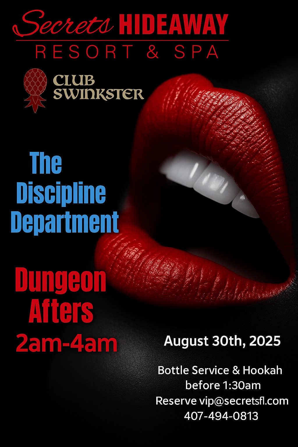 It’s 2:00am, but the night is far from over—welcome to Dungeon Afters inside Club Swinkster™. For those craving more after the main event, “The Discipline Department” opens its doors from 2am to 4am for an ultra-kinky experience that pushes boundaries and unleashes your deepest desires. Shadows flicker, toys gleam, and the sound of anticipation fills the air as doms, subs, and voyeurs gather for an unforgettable late-night rendezvous.