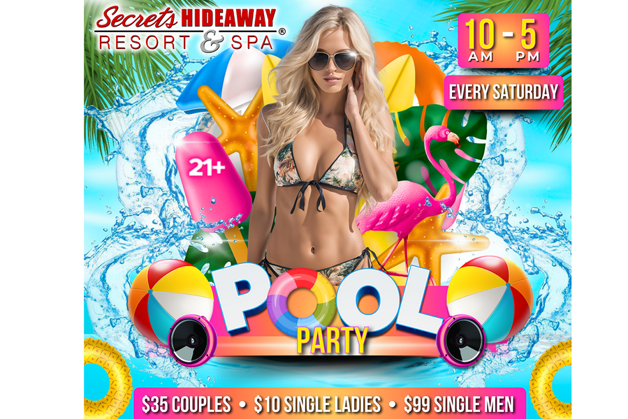 At the Saturday Pool Party, the atmosphere is charged with an electrifying blend of sensuality and sunshine. For those seeking the ultimate in luxury and privacy, reserving a pool-side cabana offers eight hours of opulent relaxation, where you can bask in the sun-kissed ambiance and indulge in arousing fun. Alternatively, slip away to the inviting playrooms, where you can create your own heat and explore the depths of your desires. Whether you're lounging in luxury, dancing under the open sky, or discovering the intimate corners of Secrets Hideaway, the Saturday Pool Party promises a day of unbounded pleasure, liberating experiences, and unforgettable connections with like-minded souls. Dive into the weekend with a splash of excitement, celebrating summer in the sexiest, most enticing way imaginable.