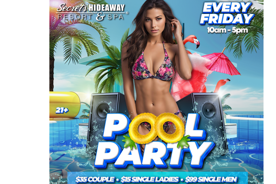 Kick off your weekend in style at the Friday Pool Party, an enticing affair hosted every Friday from 10 am to 5 pm at Secrets Hideaway Resort & Spa. Immerse yourself in the ultimate daytime indulgence as you join Orlando's most exhilarating clothing-optional pool party. From the moment the clock strikes 10 am, the party comes alive with refreshing cold drinks served at the lively tiki bar, a delectable lunch and dinner menu, and the infectious beats spun by our professional DJs, setting the perfect backdrop for a day of carefree fun and relaxation. At Secrets Hideaway, we offer not just a pool party but an experience where you can revel in the sun, enjoy tantalizing food and drinks, and groove to your favorite tunes, all in the company of friendly, open-minded individuals.