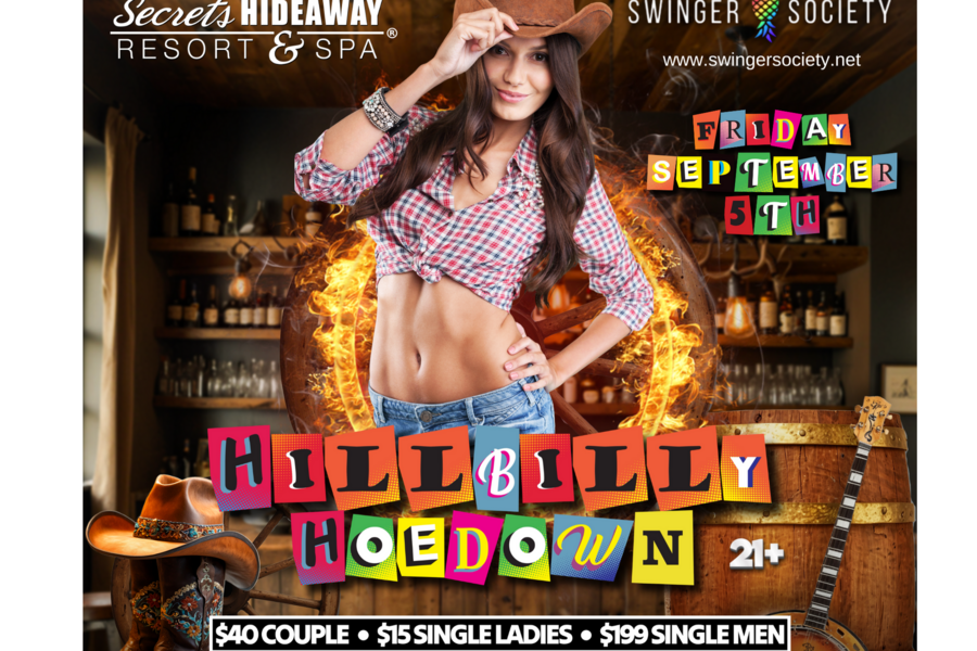 Dust off your overalls, knot those plaid shirts, and get ready to holler—Swingers Society brings a down‑home dose of mischief to Secrets Hideaway with the “Hillbilly Hoedown” on Friday, September 5th. Step onto the porch‑style dance floor where twangy country beats mix with bump‑and‑grind rhythms, mason‑jar cocktails flow like moonshine, and barn‑yard décor sets the stage for pure, unfiltered fun. Whether you’re rockin’ daisy dukes, cut‑off flannels, or nothing but a piece of hay between your teeth, this is the night to let your inner country rebel run wild.