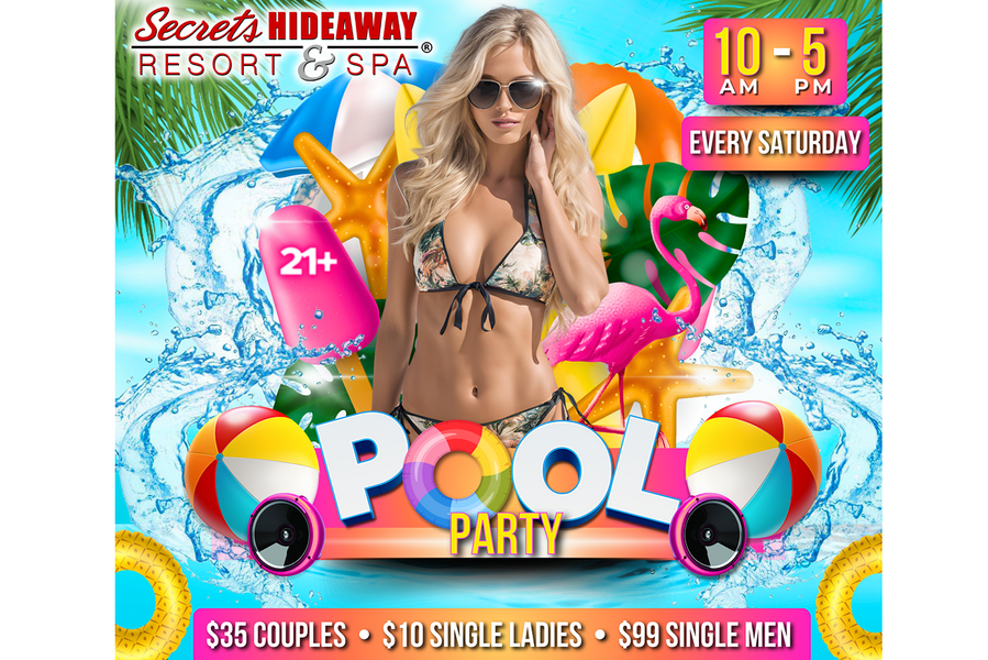 At the Saturday Pool Party, the atmosphere is charged with an electrifying blend of sensuality and sunshine. For those seeking the ultimate in luxury and privacy, reserving a pool-side cabana offers eight hours of opulent relaxation, where you can bask in the sun-kissed ambiance and indulge in arousing fun. Alternatively, slip away to the inviting playrooms, where you can create your own heat and explore the depths of your desires. Whether you're lounging in luxury, dancing under the open sky, or discovering the intimate corners of Secrets Hideaway, the Saturday Pool Party promises a day of unbounded pleasure, liberating experiences, and unforgettable connections with like-minded souls. Dive into the weekend with a splash of excitement, celebrating summer in the sexiest, most enticing way imaginable.