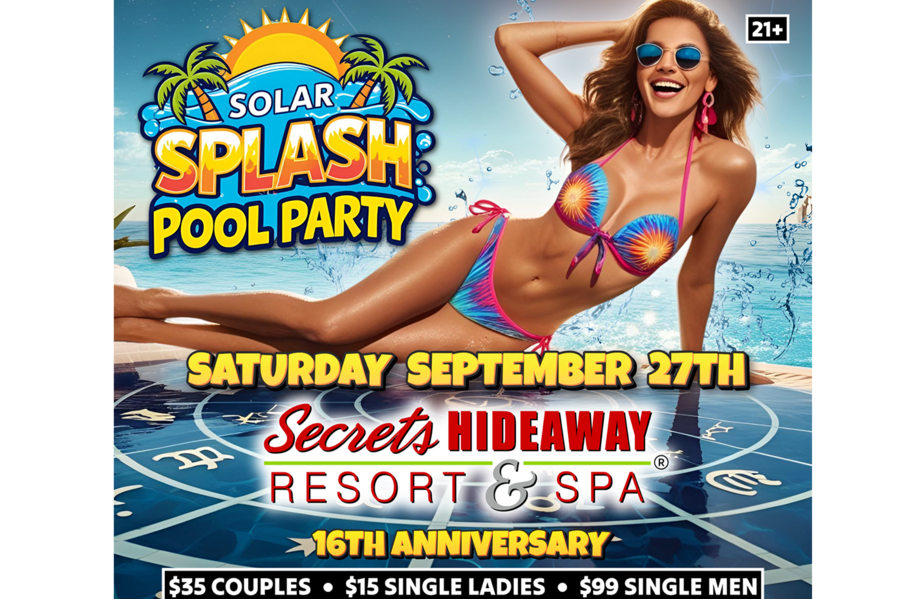 Soak up the heat and dive into the fun at the "Solar Splash Pool Party" on Saturday, September 27th, from 10am – 5pm, as Secrets Hideaway continues its epic 16th Anniversary celebration! This high-energy, clothing-optional pool party is your chance to let loose under the blazing sun with tropical drinks in hand, top DJs spinning the hottest tracks, and the sexiest crowd in the lifestyle community turning up the heat. Whether you're floating, dancing, or tanning your buns, this is where the celebration truly explodes into full swing.