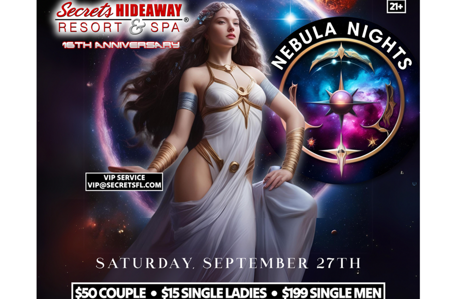 With top DJs fueling the vibe, seductive performances, and a sky full of possibilities, Nebula Nights is where passion defies gravity and the energy is electric. Mingle with fellow celestial souls, toast to 16 unforgettable years, and lose yourself in a universe where fantasy becomes reality. It’s not just a party—it’s a cosmic celebration of connection, community, and the boundless future of Secrets Hideaway.