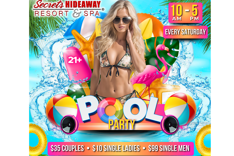 At the Saturday Pool Party, the atmosphere is charged with an electrifying blend of sensuality and sunshine. For those seeking the ultimate in luxury and privacy, reserving a pool-side cabana offers eight hours of opulent relaxation, where you can bask in the sun-kissed ambiance and indulge in arousing fun. Alternatively, slip away to the inviting playrooms, where you can create your own heat and explore the depths of your desires. Whether you're lounging in luxury, dancing under the open sky, or discovering the intimate corners of Secrets Hideaway, the Saturday Pool Party promises a day of unbounded pleasure, liberating experiences, and unforgettable connections with like-minded souls. Dive into the weekend with a splash of excitement, celebrating summer in the sexiest, most enticing way imaginable.