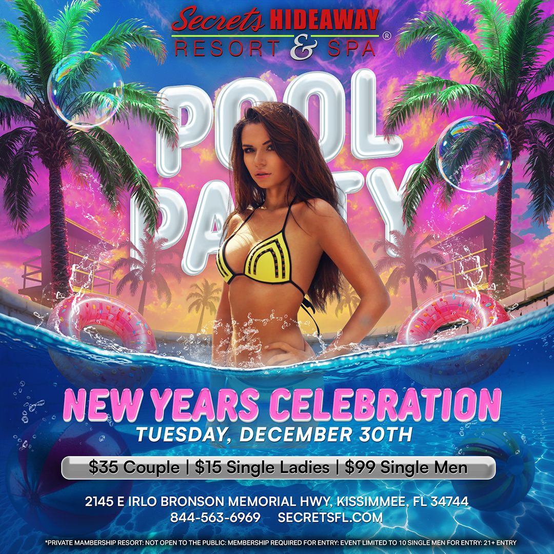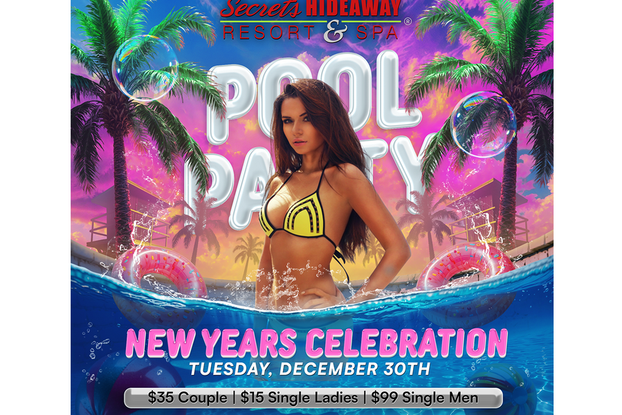 Secrets Hideaway presents the New Year’s Pool Party on Tuesday, December 30th, from 10am to 5pm—the ultimate way to kick off your New Year’s Celebration in true lifestyle fashion! Slip into your tiniest bikini, or nothing at all, and dive into a day filled with sunshine, music, and sexy vibes. Our clothing-optional pool deck is the perfect place to relax, tan, and meet other uninhibited partygoers ready to ring in the new year with passion and excitement.