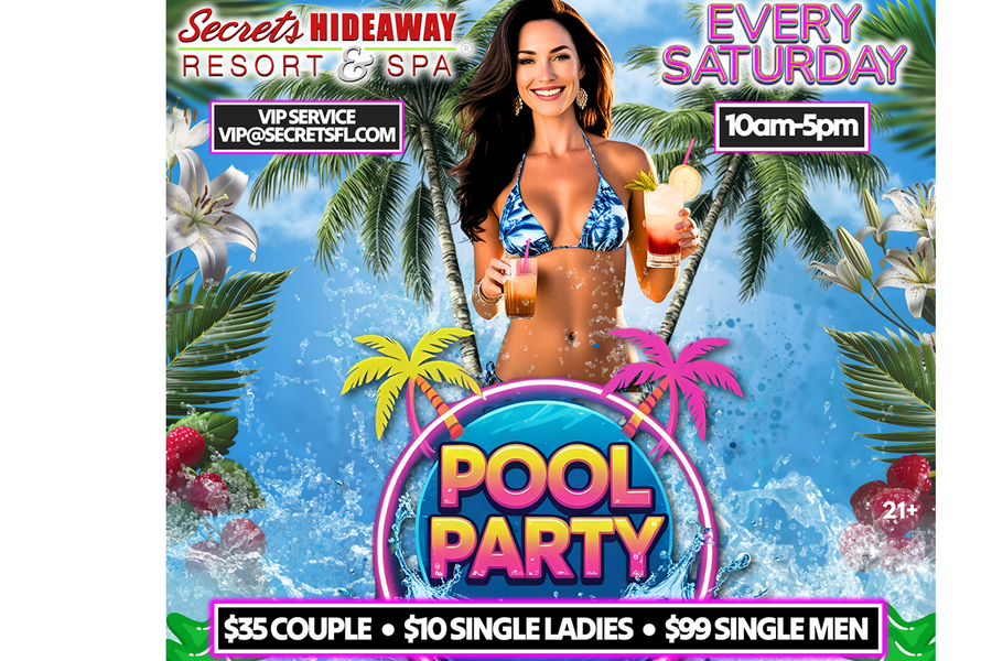 Get ready to indulge in the epitome of Saturday bliss at Secrets Hideaway's exclusive Saturday Pool Party, held every Saturday from 10 am to 5 pm. Shed your inhibitions along with your clothes and immerse yourself in the epitome of sensual freedom at Orlando's hottest clothing-optional pool event. With the sun beaming down and the temperature rising, Secrets Hideaway invites you to strip down, cool off, and join your sexiest friends for a day of pure, unadulterated pleasure. Picture yourself lounging poolside, drink in hand, surrounded by the rhythmic beats of hot music and the sizzling presence of even hotter friends. Secrets Hideaway Resort and Spa's courtyard pool area, complemented by two outdoor tiki bars, forms the perfect backdrop for this seductive rendezvous, where you can let go, be free, and celebrate the heat of summer in the most alluring way possible.