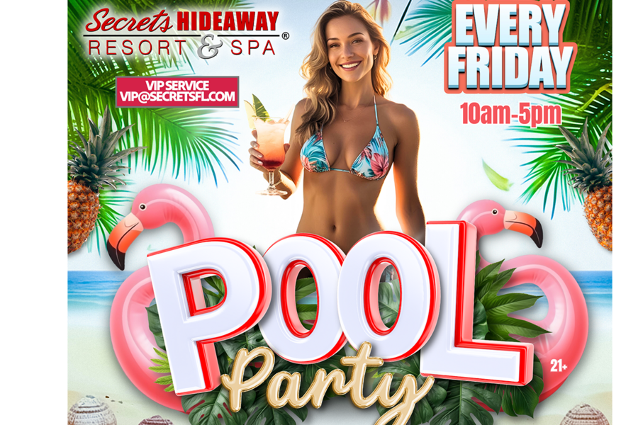 The Friday Pool Party at Secrets Hideaway invites you to unwind and celebrate the start of the weekend amidst a vibrant, tropical atmosphere. For those seeking a touch of luxury, renting a cabana offers eight hours of pure indulgence, providing a comfortable and intimate space to enjoy the company of your favorite friends. It's an opportunity to escape the routine, bask in the warm Florida sun, and connect with like-minded souls in an environment that exudes a sense of freedom and camaraderie. Starting your weekend off right with the Friday Pool Party guarantees an unforgettable experience, surrounded by the laughter, energy, and excitement of your Secret's friends, making it the ideal way to set the tone for an amazing weekend ahead.