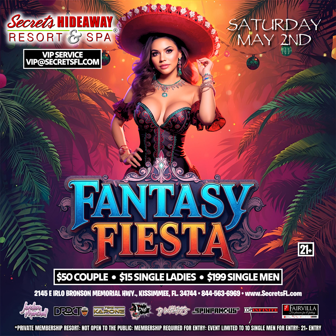 Secrets Hideaway presents “Fantasy Fiesta” on Saturday, May 2nd! Heat up the night and unleash your boldest fantasies as Secrets transforms into a sizzling celebration inspired by vibrant Mexican flair. Slip into your sexiest fiesta-themed outfit—think spicy colors, seductive skirts, sombreros with a twist, embroidered lingerie, or anything that brings out your caliente side. Tonight is all about passion, color, and playful temptation as the party erupts with festive energy and irresistible charm.