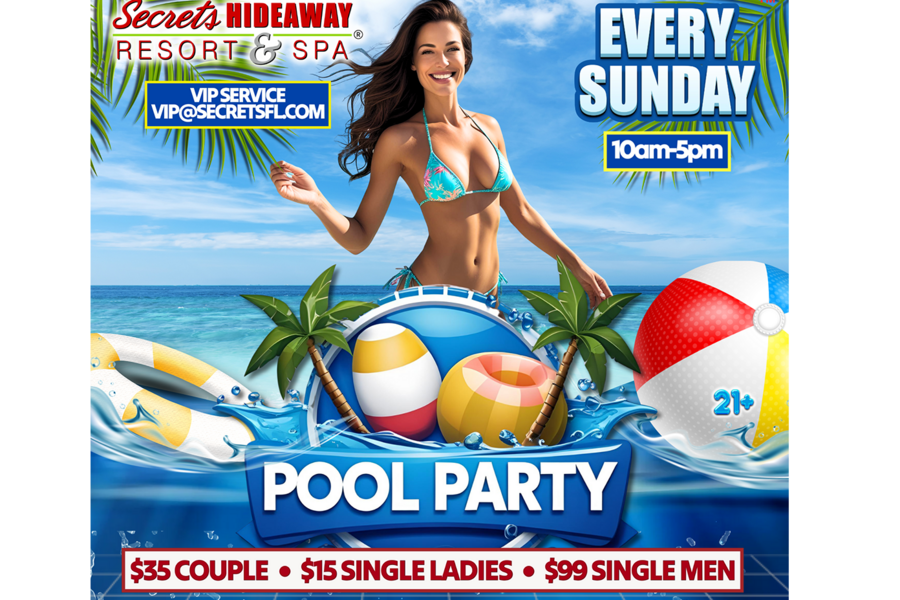 Sundays have never been more liberating! Join us every Sunday from 10 am to 5 pm for the ultimate relaxation and rejuvenation at Secrets Hideaway's Sunday Pool Party. Whether you're extending the weekend fun with Sunday Funday or winding down from a wild adventure, this day is tailored for pure bliss under the warm Florida sun. Forget about swimsuits – at this clothing-optional paradise, come as you are and stretch out in one of our two inviting pools, letting the radiant sunshine kiss your skin as you bask in complete relaxation. Our bubbling hot tubs offer a soothing escape, and the conversation pool provides the ideal setting to make new friends, sparking conversations that linger with the promise of exciting connections.