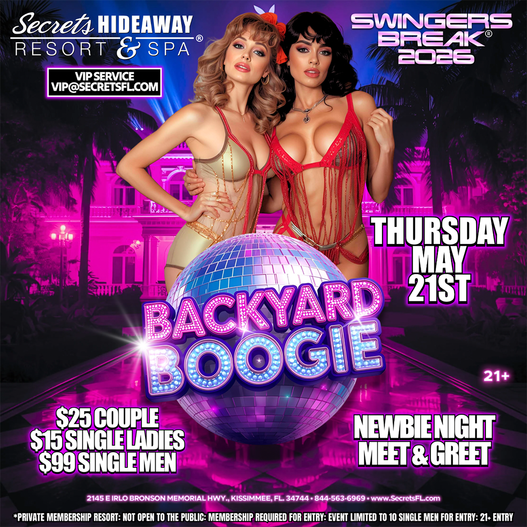 Swingers Break® Takeover presents “Backyard Boogie Meet & Greet” on Thursday, May 21st at Secrets Hideaway Resort & Spa! Kick off the weekend with a retro-inspired welcome party where Playboy Mansion glamour meets Hollywood chic, all wrapped in the sensual groove of the sexy 70s disco era. Slip into something vintage, vibrant, or wildly flirtatious—think satin shorts, glam robes, disco minis, or bold patterns straight from the golden age of decadence. This meet & greet sets the tone with smooth vibes, seductive style, and an atmosphere designed to spark instant chemistry among guests.