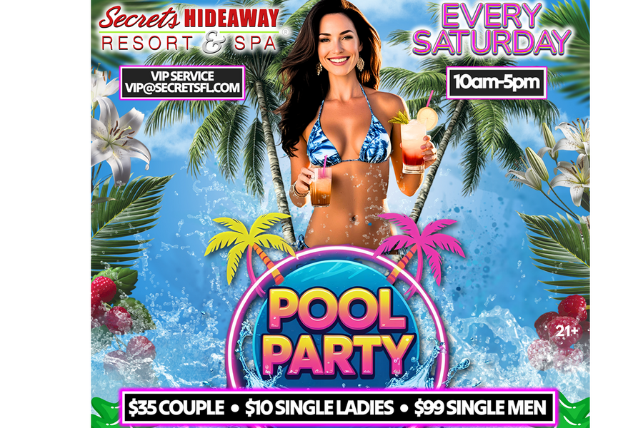 Get ready to indulge in the epitome of Saturday bliss at Secrets Hideaway's exclusive Saturday Pool Party, held every Saturday from 10 am to 5 pm. Shed your inhibitions along with your clothes and immerse yourself in the epitome of sensual freedom at Orlando's hottest clothing-optional pool event. With the sun beaming down and the temperature rising, Secrets Hideaway invites you to strip down, cool off, and join your sexiest friends for a day of pure, unadulterated pleasure. Picture yourself lounging poolside, drink in hand, surrounded by the rhythmic beats of hot music and the sizzling presence of even hotter friends. Secrets Hideaway Resort and Spa's courtyard pool area, complemented by two outdoor tiki bars, forms the perfect backdrop for this seductive rendezvous, where you can let go, be free, and celebrate the heat of summer in the most alluring way possible.