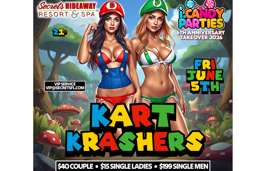 i.Candy Lifestyles Takeover presents “Kart Krashers” on Friday, June 5th at Secrets Hideaway Resort & Spa! Step into a playful, high-energy world inspired by the iconic chaos of Mario-style kart racing, where bright colors, bold characters, and mischievous fun take center stage. Slip into your sexiest racer, princess, or villain-inspired outfit—think overalls with a twist, checkered prints, colorful minis, or character-themed lingerie—and get ready to bring your favorite fantasy racer to life. Tonight’s all about speed, style, and a little bit of naughty nostalgia.