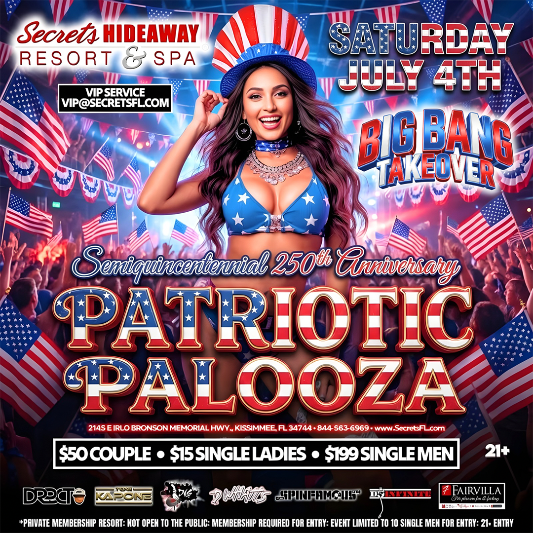 Big Bang™ Independence Weekend Takeover at Secrets Hideaway proudly presents “Patriotic Palooza” on Saturday, July 4th — the ultimate red, white, and blue celebration! Join us as we honor America’s Semiquincentennial and celebrate the nation’s historic 250th Anniversary in true Big Bang™ style. This is not just a party… it’s a full-throttle freedom fest packed with high-energy beats, sizzling summer vibes, and a sea of sexy patriotic fashion lighting up the resort.