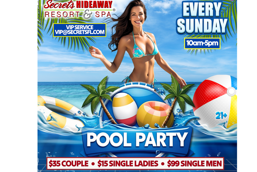Sundays have never been more liberating! Join us every Sunday from 10 am to 5 pm for the ultimate relaxation and rejuvenation at Secrets Hideaway's Sunday Pool Party. Whether you're extending the weekend fun with Sunday Funday or winding down from a wild adventure, this day is tailored for pure bliss under the warm Florida sun. Forget about swimsuits – at this clothing-optional paradise, come as you are and stretch out in one of our two inviting pools, letting the radiant sunshine kiss your skin as you bask in complete relaxation. Our bubbling hot tubs offer a soothing escape, and the conversation pool provides the ideal setting to make new friends, sparking conversations that linger with the promise of exciting connections.
