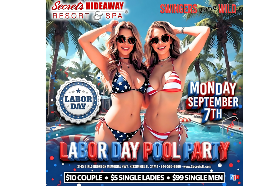 Soak up the sun and keep the party going as Swingers Gone Wild® Labor Day Weekend Takeover at Secrets Hideaway presents the “Labor Day Pool Party” on Monday, Sept 7th from 10am–5pm! Join us poolside for the ultimate daytime celebration filled with great music, refreshing drinks, and nonstop fun under the Florida sun. Grab your sexiest swimwear, sunglasses, and your favorite crew as we turn the pool area into a high-energy playground to close out an unforgettable holiday weekend.