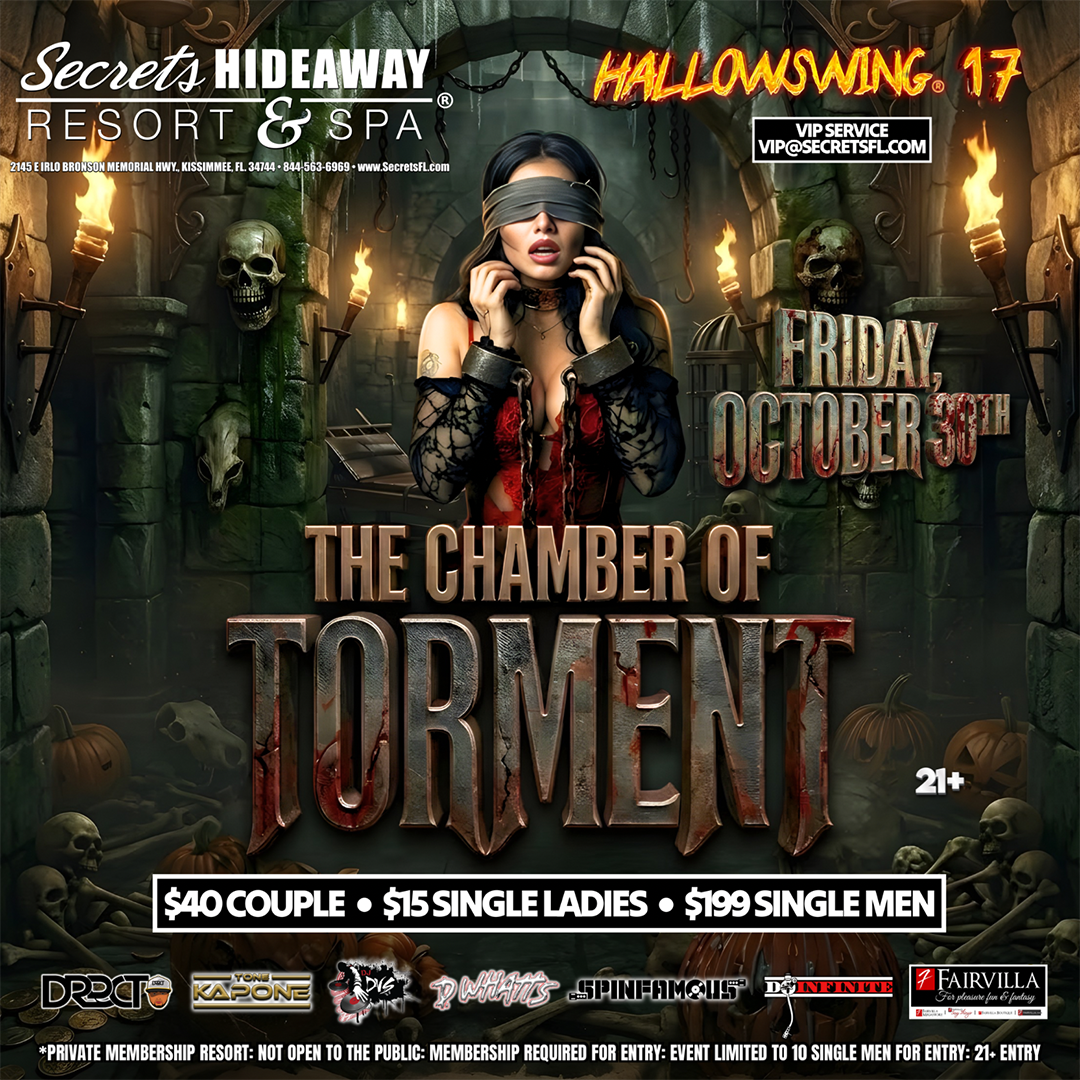 Hallowswing® 17 descends into pure darkness at Secrets Hideaway Resort & Spa on Friday, October 30th with “The Chamber of Torment,” a night where fear, mystery, and forbidden energy take over the resort. Hidden deep within the shadows lies a dungeon where the air is thick with suspense and every step feels like you’ve crossed into another world. Chains rattle in the distance, doors creak open, and the unknown waits behind every corner. This is a night inspired by haunted dungeons, dark rituals, and the thrill of surrendering to the eerie atmosphere of Halloween’s most intense celebration.