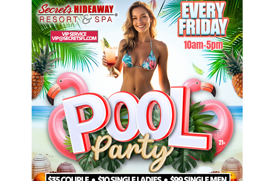 The Friday Pool Party at Secrets Hideaway invites you to unwind and celebrate the start of the weekend amidst a vibrant, tropical atmosphere. For those seeking a touch of luxury, renting a cabana offers eight hours of pure indulgence, providing a comfortable and intimate space to enjoy the company of your favorite friends. It's an opportunity to escape the routine, bask in the warm Florida sun, and connect with like-minded souls in an environment that exudes a sense of freedom and camaraderie. Starting your weekend off right with the Friday Pool Party guarantees an unforgettable experience, surrounded by the laughter, energy, and excitement of your Secret's friends, making it the ideal way to set the tone for an amazing weekend ahead.