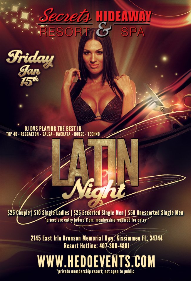 One of our HOTTEST nights is back. That’s right Secrets Hideaway is very proud to bring back Latin Night. We would love to see our local Latinas y Latinos on the floor dancing to the mesmerizing beat. Don't miss an erotic night of passion and lust, drinking, dancing and fun. Latin music is a heated flavor that brings in many sexy Lifestyle friends to enjoy the night. With DJ DVS playing the best of Top 40, Latin-Pop, Reggaeton, Salsa, Bachata, and Merengue, the dance floor will be crowded with sensual dancing all night long.