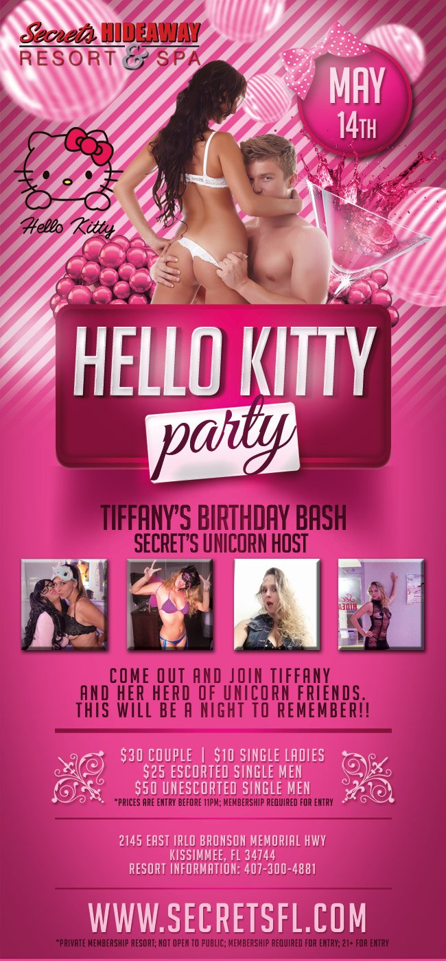 Tonight, Secrets Hideaway is combining cute with sexy and throwing our first ever Hello Kitty Party. Join us in celebrating the birthday of our Unicorn Host - Tiffany. She and her herd of unicorns will be prancing about at Secrets Hideaway. Ladies AND gentlemen, can have fun by dressing up for this theme. Let’s see how sexy you can make Hello Kitty. Make sure you give Tiffany lots of hugs and kisses for her birthday!!! This will be a night to remember!!!