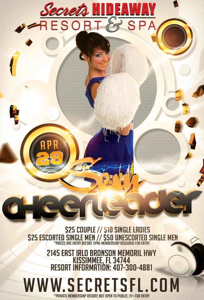 Give me an S! Give me an E! Give me a C! Give me an R! Give me an E! Give me a T! Give me an S! What’s that spell? SECRETS!!!! Show your team spirit tonight at Secrets Hideaway with our Sexy Cheerleader Party. Whether you like football, baseball, basketball or hockey, we all love the sexy cheerleaders. Ladies, you can make it even sexier with pony tails and knee high socks. Guys, drive the girls wild by bringing out your inner stud.