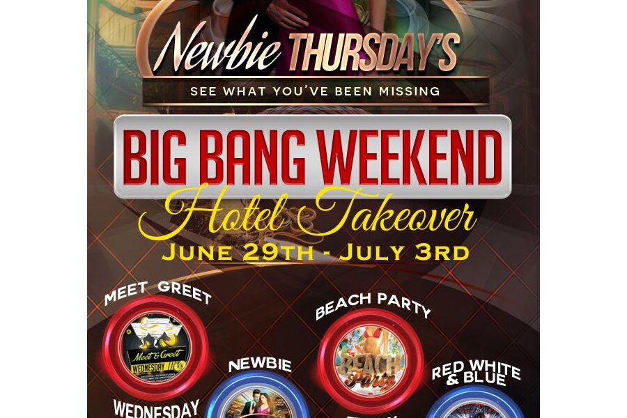 Welcome Summer!! Oh how we have missed you. On June 29th through July 2nd Secrets Hideaway is pleased to bring you our Third Annual Big Bang Weekend. This year we have added another day of hedonistic fun. Come celebrate your independence with clothing optional pool parties, naked volleyball, and nightly parties!! Club Secret opens every night at 7:30 as well as our complimentary dinner buffet.
