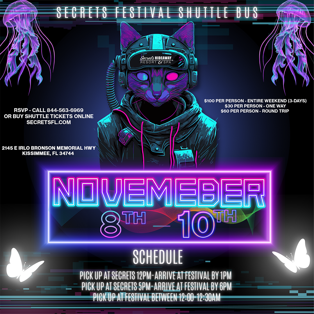 Shuttle buss for November 8-10 for the festival will be happening this year. Avoid the wait of taxi services and purchase the weekend pass online at https://www.secretsfl.com/.../flashback-friday/purchase-pass